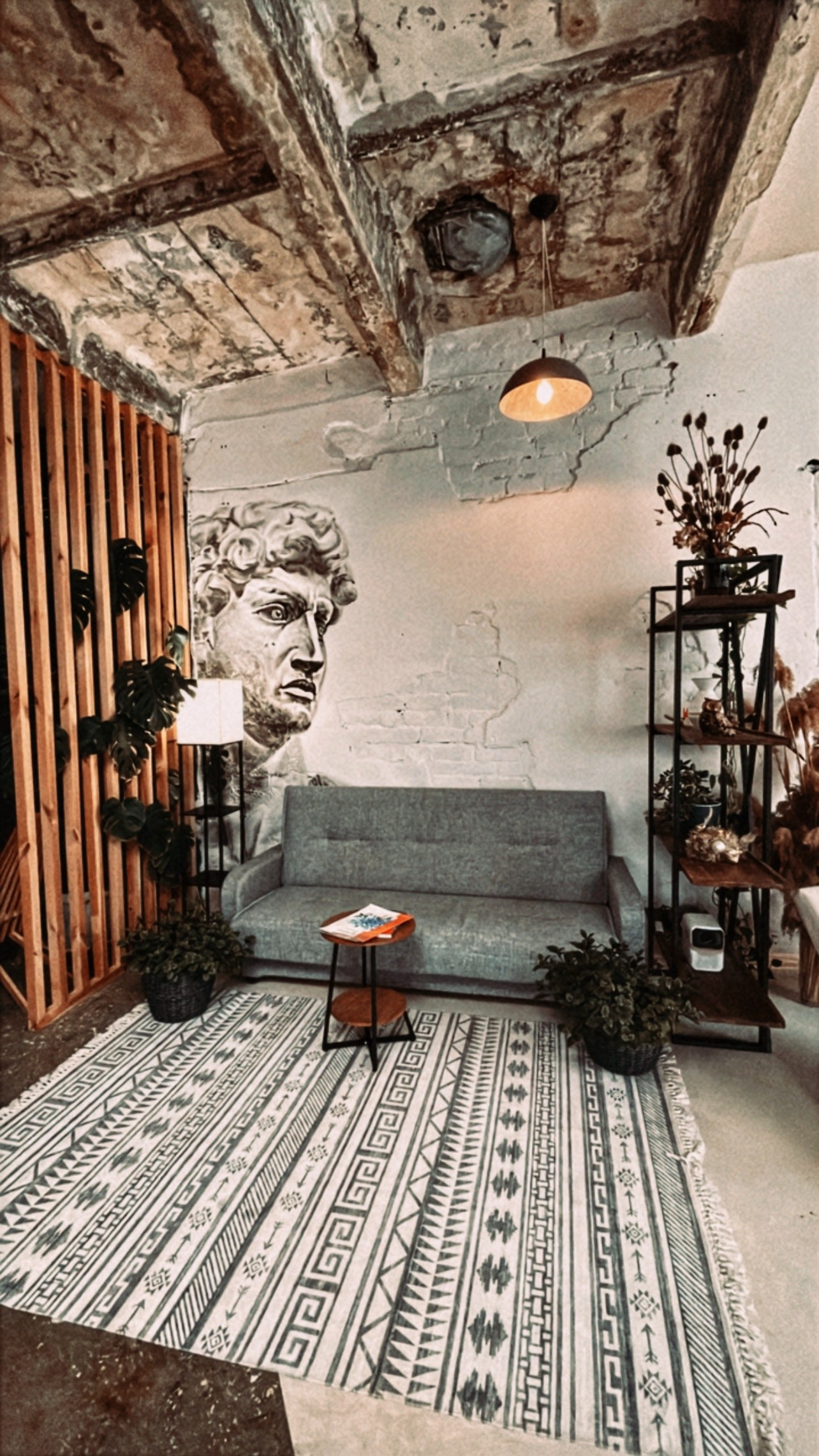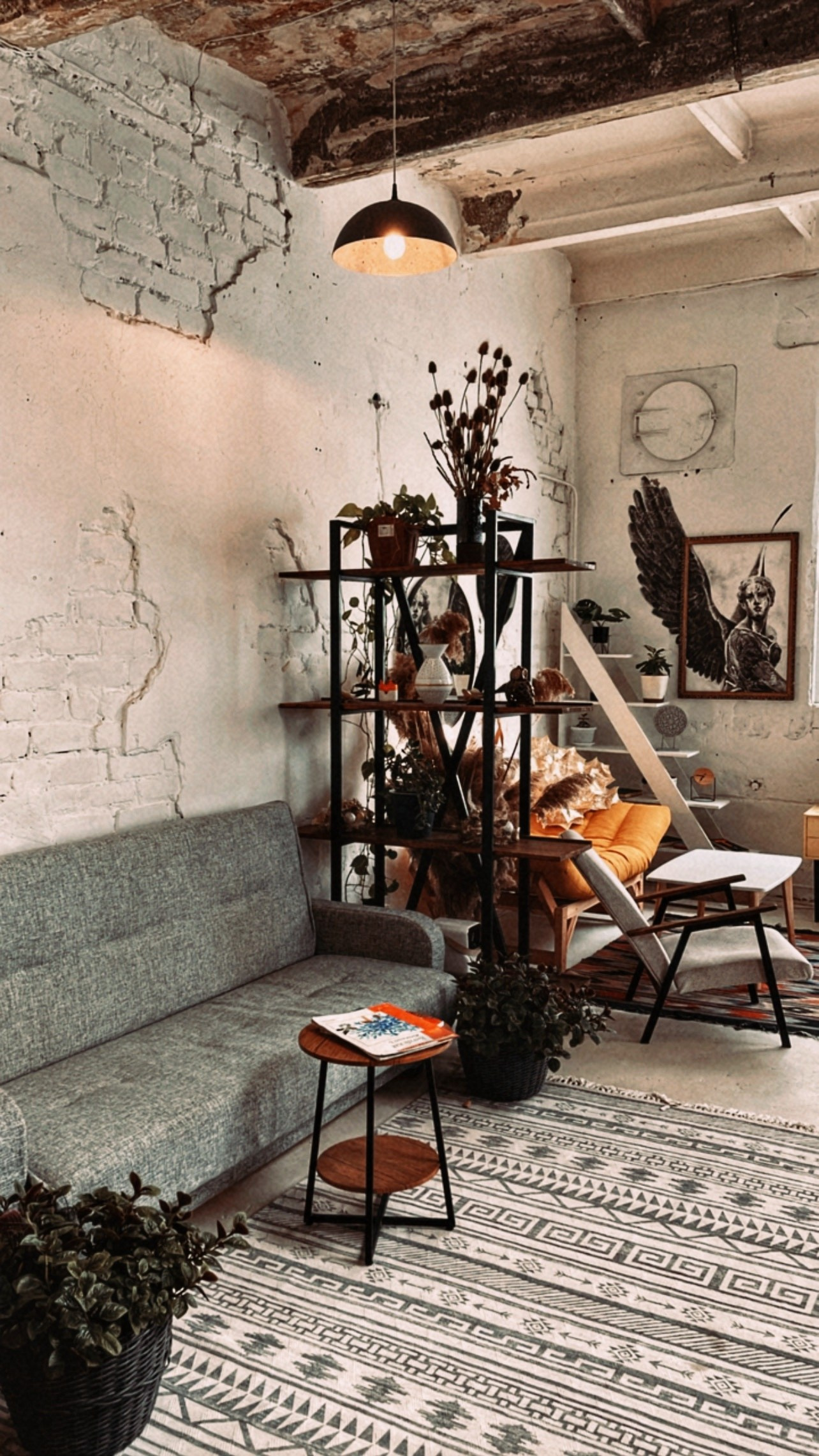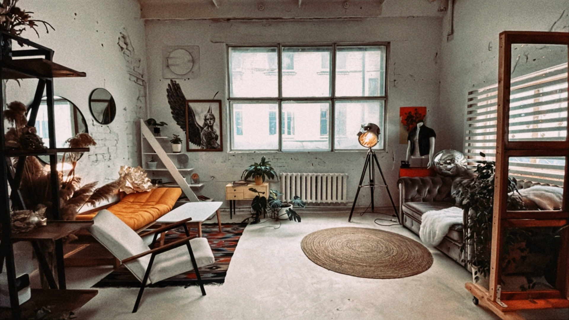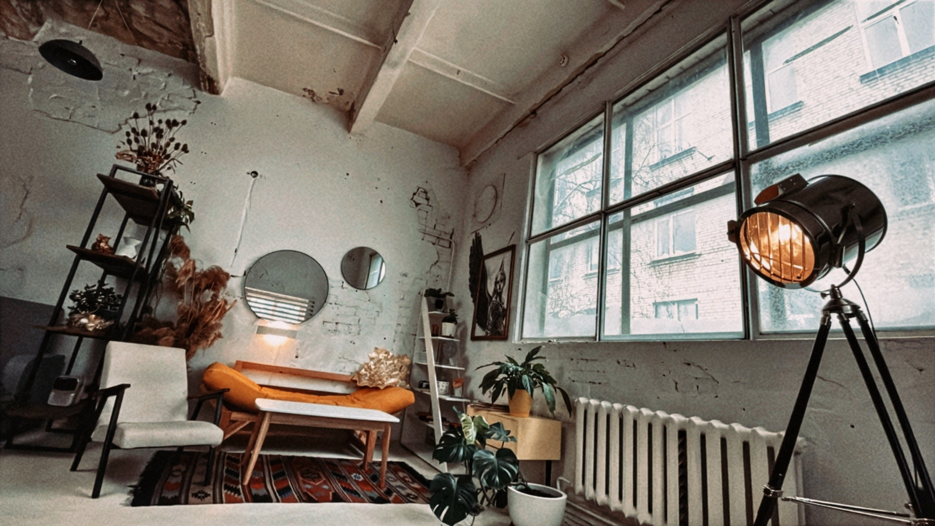 Зал совмещает индустриальные элементы лофта и винтажную эстетику: открытый потолок высотой 4 метра, крупные окна, фактурные стены, живая зелень и акцентные предметы декора. Площадь — 60 м².