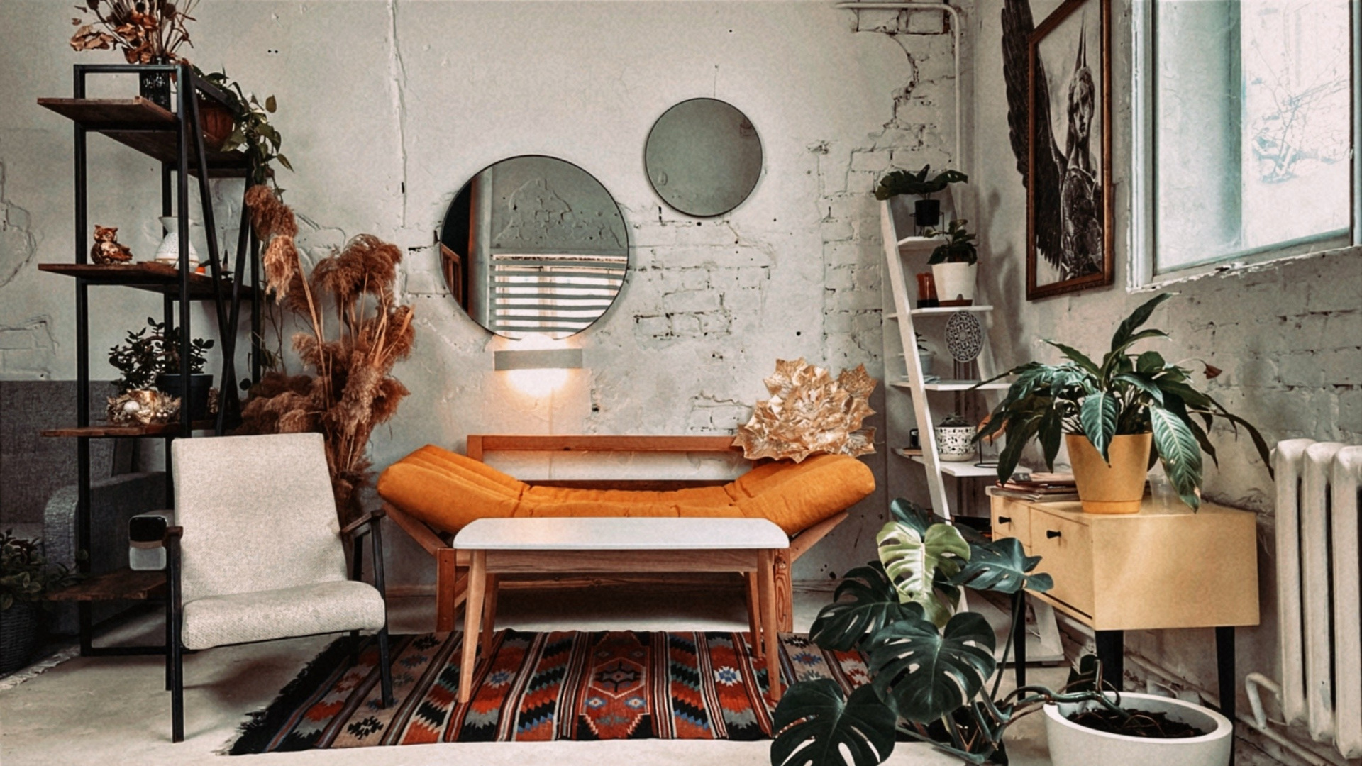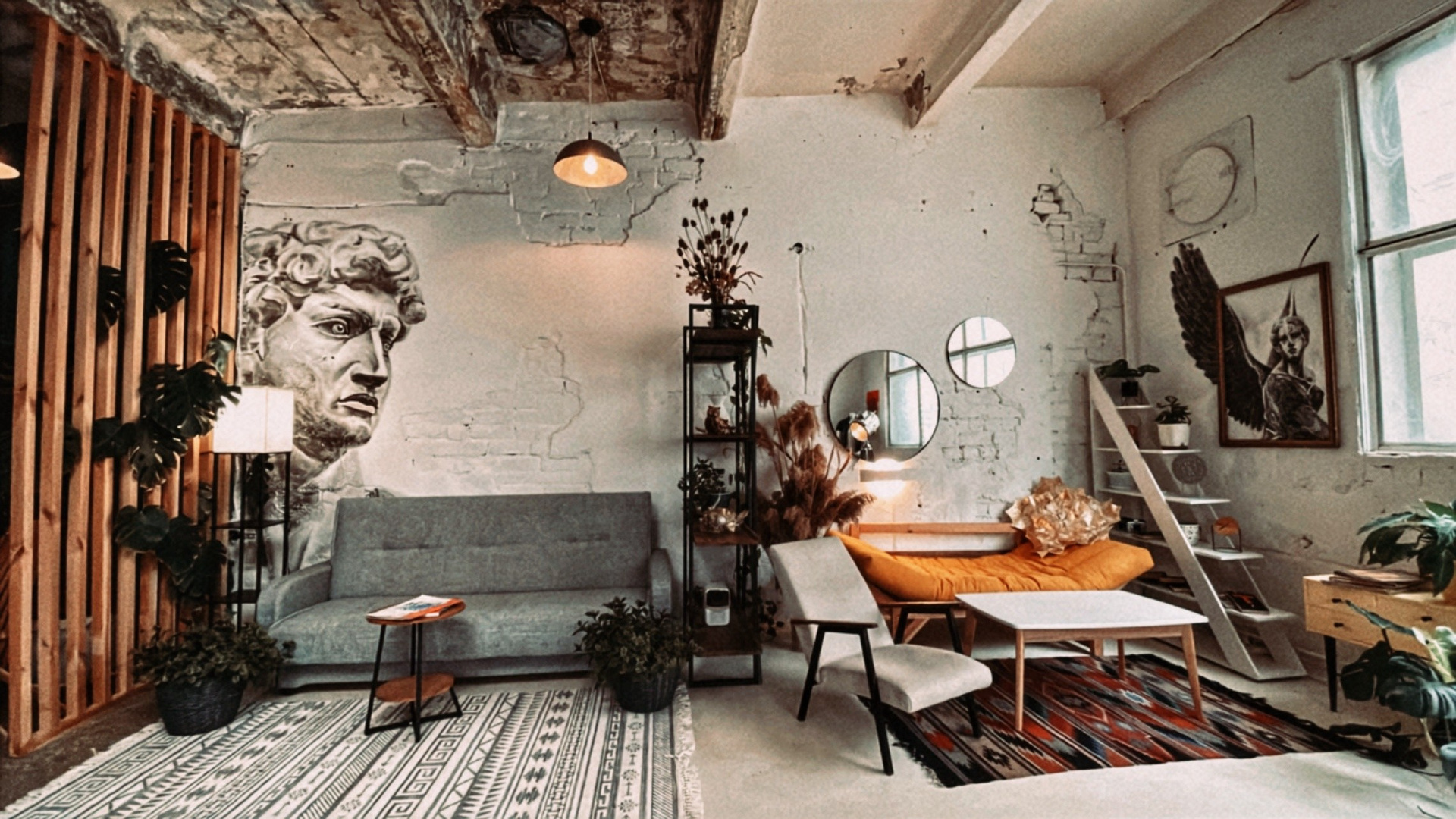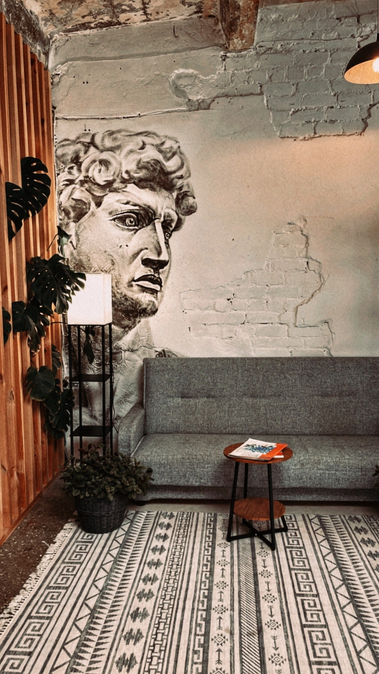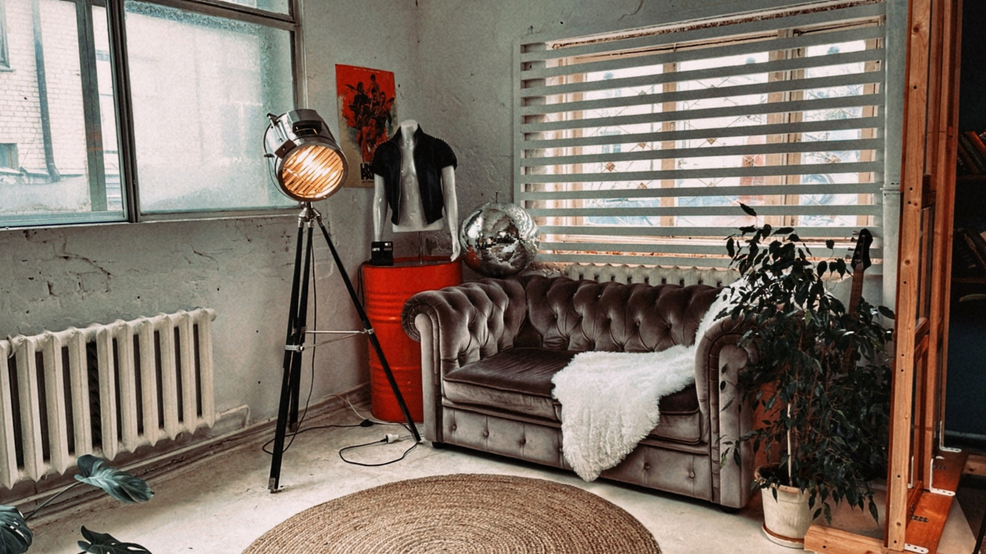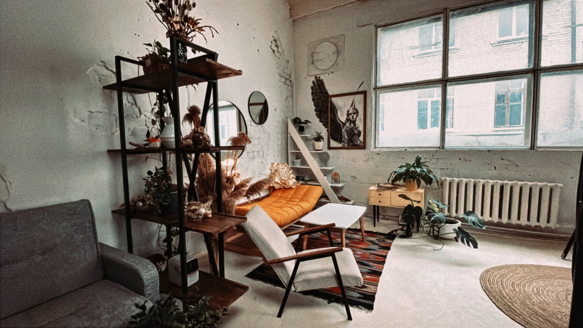Зал совмещает индустриальные элементы лофта и винтажную эстетику: открытый потолок высотой 4 метра, крупные окна, фактурные стены, живая зелень и акцентные предметы декора. Площадь — 60 м².