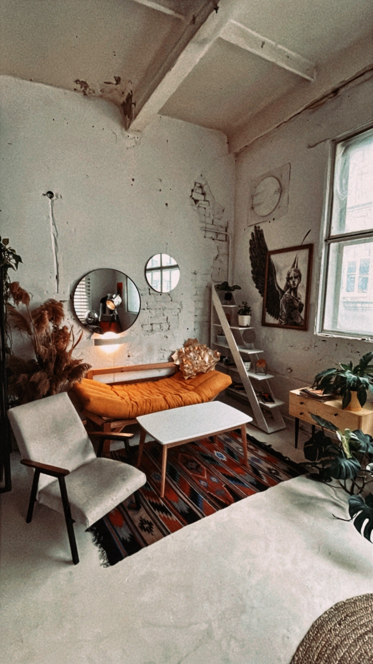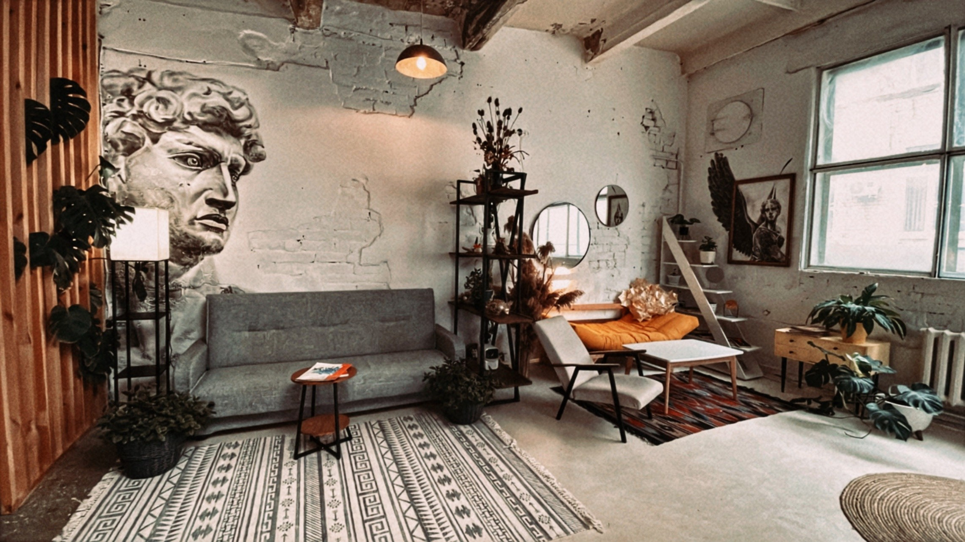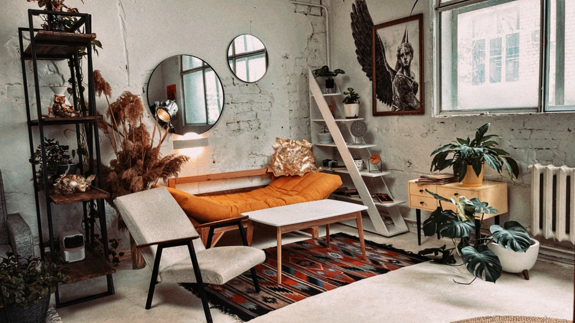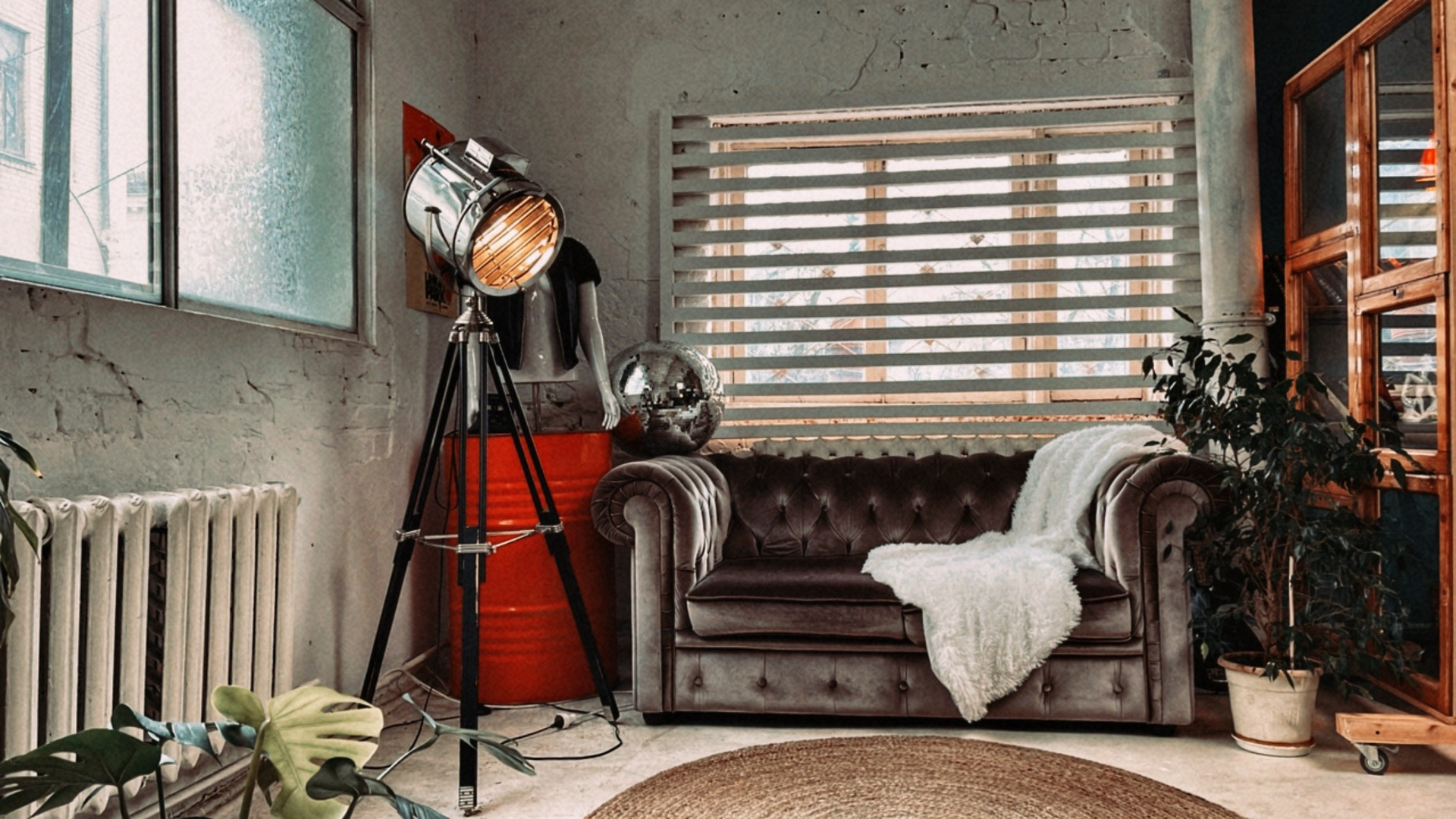 Зал совмещает индустриальные элементы лофта и винтажную эстетику: открытый потолок высотой 4 метра, крупные окна, фактурные стены, живая зелень и акцентные предметы декора. Площадь — 60 м².
